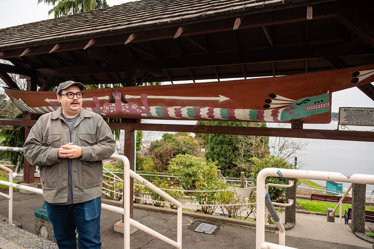 Eliot White-Hill, Kwulasultun, talks about his great, great, great grandfather Albert Wesley’s canoe that is displayed on Front Street in Downtown Nanaimo during a walking tour with the Nanaimo Art Gallery on Friday, Nov. 14, 2025. Photo by Mick Sweetman / The Discourse.