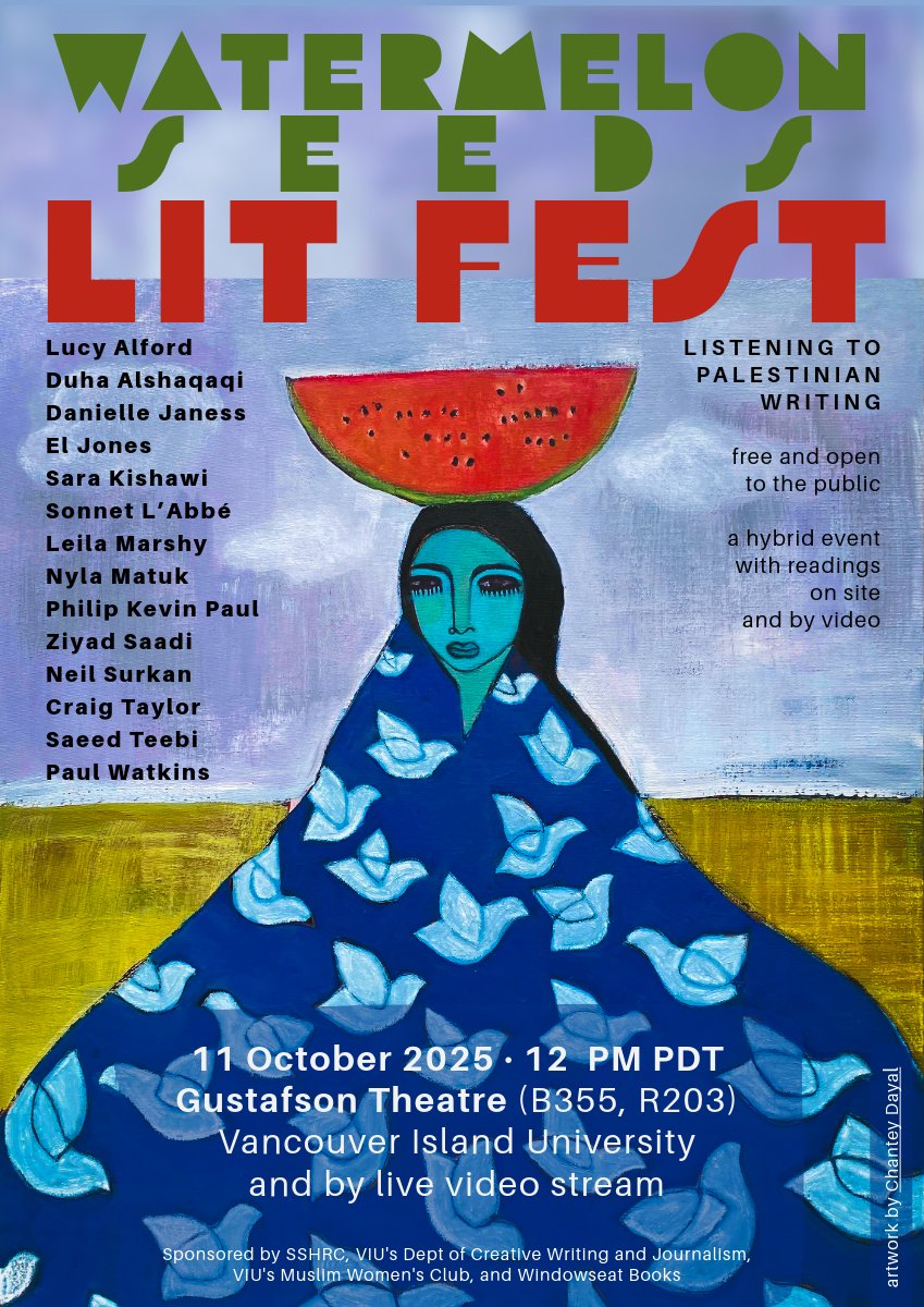 Saturday, Oct. 11, noon: The second annual Watermelon Seeds Festival of Literature will feature award-winning poets, playwrights and journalists “reading in solidarity with the Palestinian people in a time of genocide” at Vancouver Island University’s Gustafson Theatre (B355, room 203). Admission is free and open to the public.