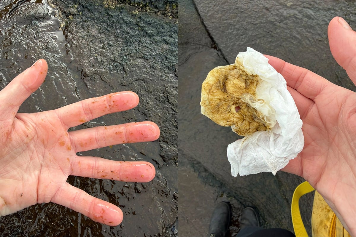 Photographs by local conservationist Jackie Wasyluk show an oily substance she found on the rocks by the shoreline near the popular Cable Bay hiking trail on Thursday, Jan. 7. Photos courtesy of Jackie Wasyluk.